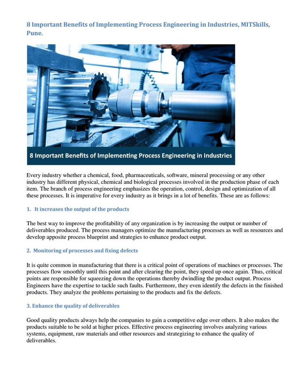 Every industry whether a chemical, food, pharmaceuticals, software, mineral processing or any other industry has different physical, chemical and biological processes involved in the production phase of each item. The branch of process engineering emphasizes the operation, control, design and optimization of all these processes. It is imperative for every industry as it brings in a lot of benefits.